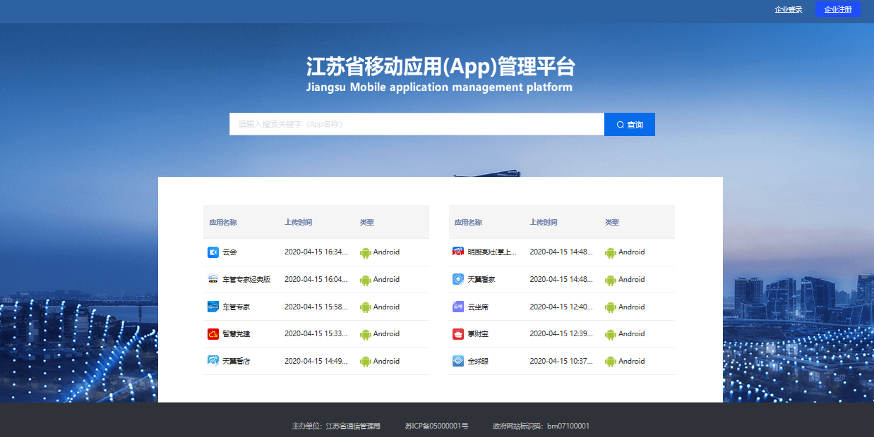 (二)在江苏省通信管理局网站的“服务直通车”栏目,点击“江苏App管理平台”进入江苏省移动应用(App)管理平台,如下图所示: