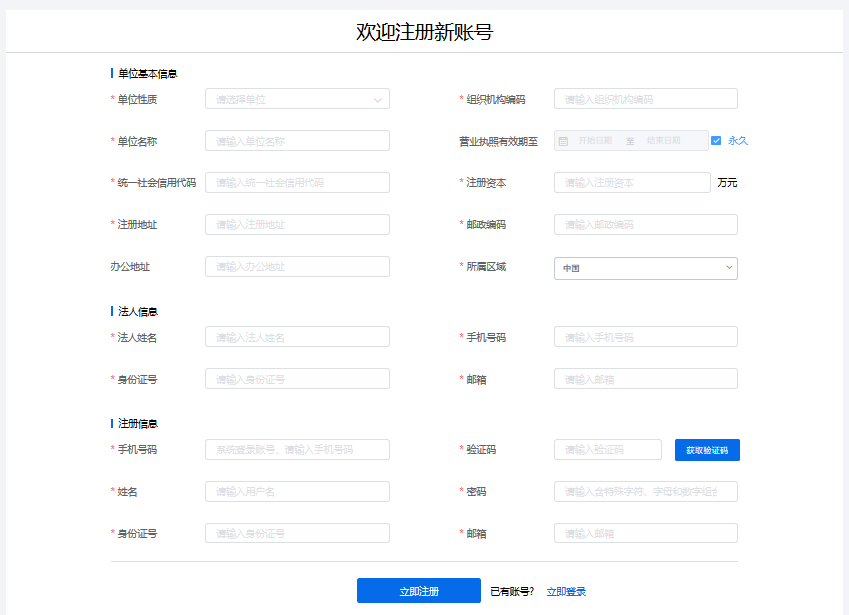 点击右上角【企业注册】按纽进入注册账号页面,输入注册信息,点击【立即注册】按纽即可成功注册账户,如下图所示。