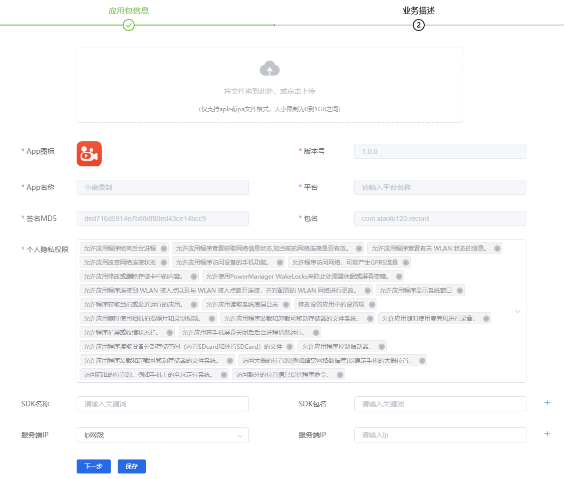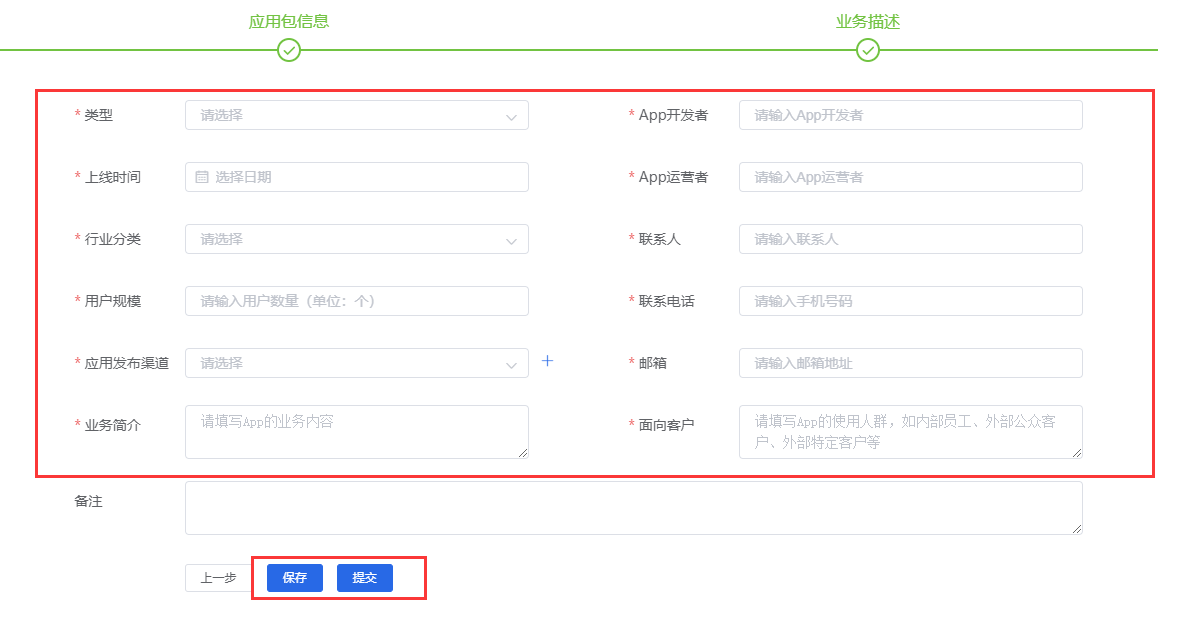 (一)登录系统后,点击APP上报-应用包页面,用户通过上传应用,输入相应信息,点击保存按纽可暂存填报信息,跳转用户中心页面进行;点击下一步按纽进入业务描述页面,输入或选择相关信息,点击提交即可成功登记App信息。填报步骤如下图所示: