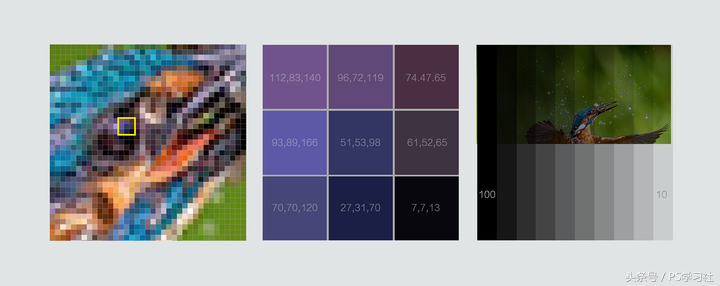 像素是矩形的,每个像素都有自己的颜色值和透明度。(右图是不同透明度的黑色叠加在图片上的效果)