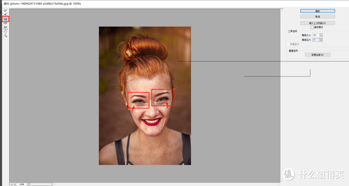 当然,液化工具还可以放大缩小,点击膨胀工具就可以使画面的部分膨胀,点击皱褶工具则可以使画面的一部分缩小,可以用在调整五官上。