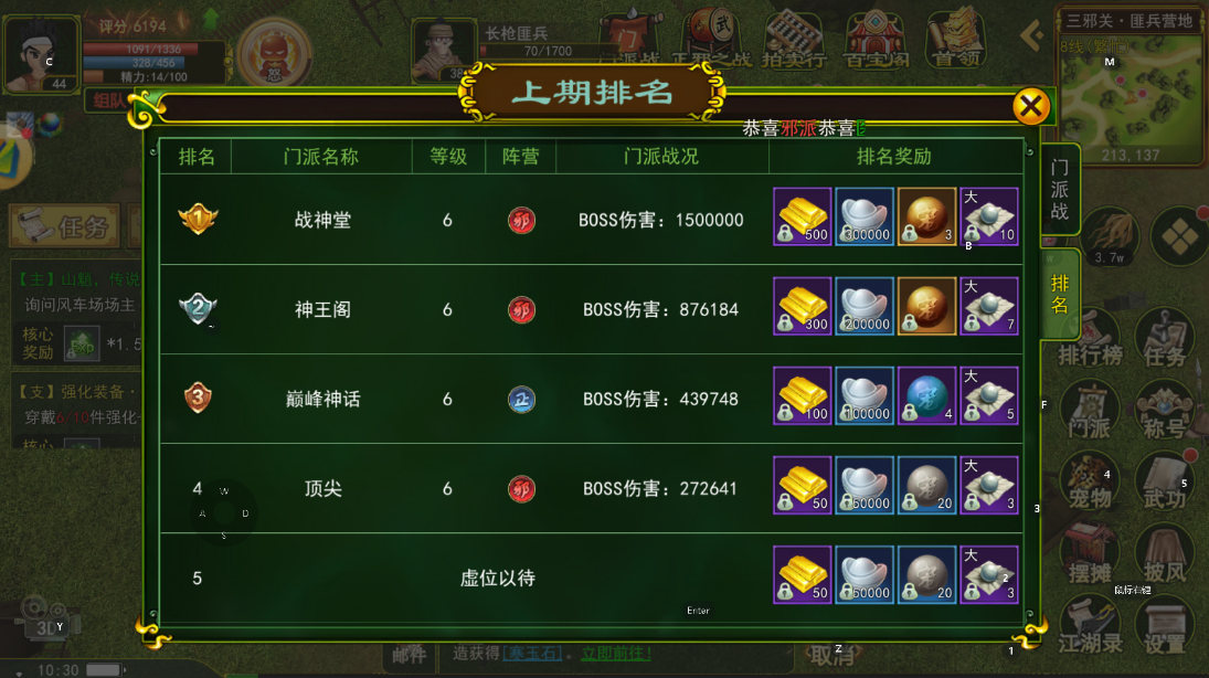 3.门派战分为两个阶段:第一阶段为门派之间进行两两PK,通过击杀对手获取积分。积分最高的门派将进入第二阶段的BOSS竞赛,第一个击败BOSS的门派将成为本期门派战的冠军。若在规定时间内未能击败BOSS,则按照造成伤害的排名进行结算。