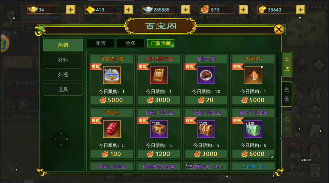 百宝阁中门派贡献可购买的东西可谓是应有尽有,包括宠物的技能箱、宠物转职凭证、宠物口粮、披风碎片、强化石、门甲宝箱、一些加buff的丹药以及消耗品等等。想要换什么都有,所以大家一定要多多捐献,增长自己的贡献值啦。完成门派捐献还可以完成江湖录中的升级任务,完成江湖录还可以增加玩家的基础属性以及特殊属性,包括掉落加成、历练加成、银两加成和经验加成。
