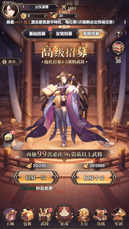 这个武将是每个玩家进入游戏后都可以通过活动获取的武将,是比较好培养的武将,而且是有一个召唤的技能的,是可以增加阵容的人数从而更好的进行输出的。