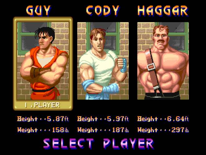 不得不说,“左右摆拳”这一招真的是闯关类游戏的一线曙光,在当时的街机厅里,几乎所有的动作闯关类游戏中都能用到这一招。而《快打旋风》中的白人科迪用起这招来更是得心应手,所以当年在街机厅里,科迪一般都是玩家们抢着选的。