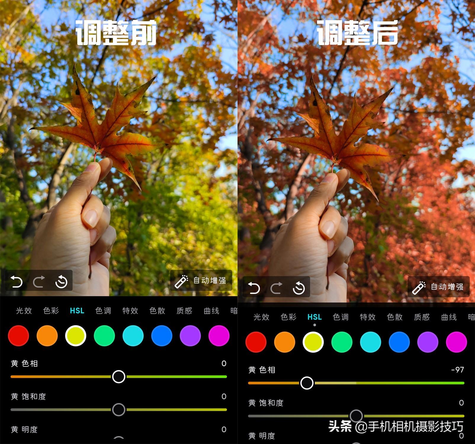 如果你拍出的秋天不够红,同样可以用HSL功能调整改变。