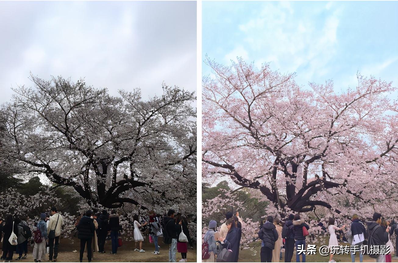 尤其是选色选项,又是拯救“废片”的一名大将。看看这张樱花照片,利用选色功能根据颜色来选区,然后色调高光和阴影都选择红色调,樱花立马就变红了。