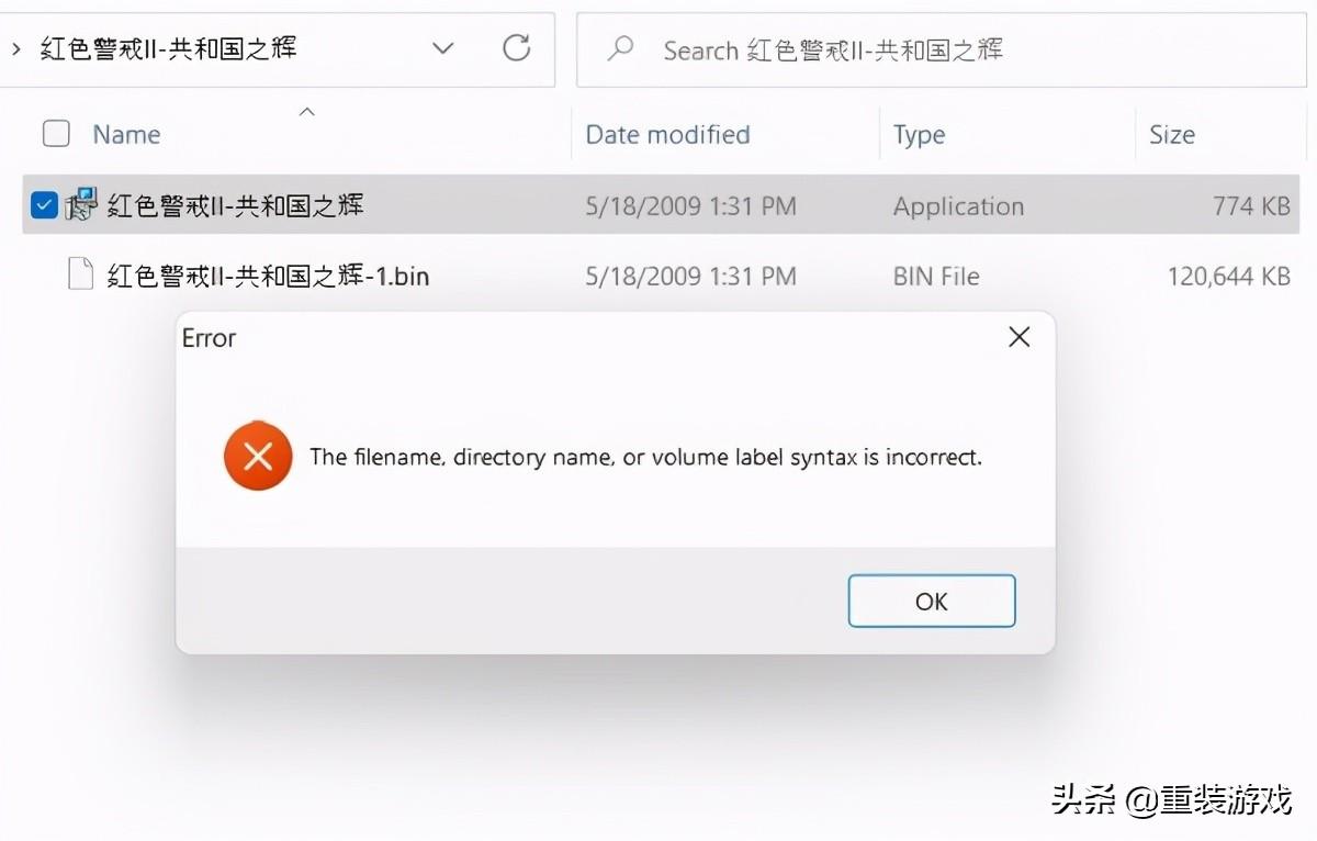 首先测试了一下我祖传的《红色警戒:共和国之辉》,果然连安装包都打不开,考虑到这个红警在Win10上就打不开倒是没什么意外。我又试了一个很久以前下载的“红色警戒2 v1.006”,结果也是一样。