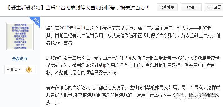 “当乐出事儿了,玩家发贴说充了100多万后被封号了。”