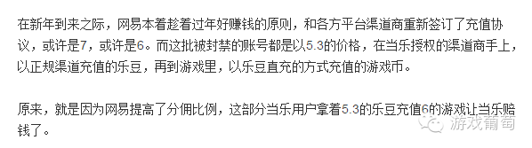 据了解,网易和当乐的分成比例一直是三七,并不存在所谓的提高分成比例的关系,而充值协议一说更是不存在。网易在去年就明令禁止过渠道充值返利的现象。