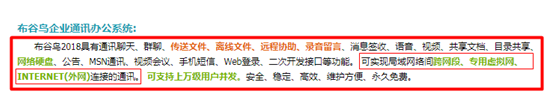 布谷鸟具有通讯聊天、群聊、传送文件、离线文件、远程协助、录音留言 、消息签收、语音、视频、目录共享、网络硬盘 、公告、视频会议、手机短信、Andriod /IOS 、网页登录、二次开发接口等功能。 可实现局域网络间跨网段、专用虚拟网、INTERNET(外网) 连接的通讯。可支持百万级用户并发。 安全、稳定、高效、维护方便、永久免费。