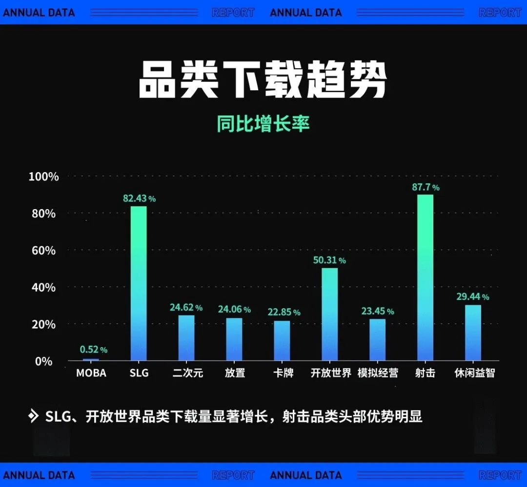 在近日新发布的《TapTap 2022 年度报告》(下简称报告)中,GameLook便惊讶于和曾经的B站一样,TapTap正在经历一场受众面快速破圈的过程。二次元、买断制付费仍是TapTap的传统优势,但SLG、放置等过去与TapTap用户偏好相左的品类也在2022年大受欢迎,下载量增幅最高达到82.43%。