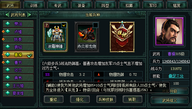 在三国中,曹操在军事、政治、文化方面都有很大的成就,在三国历史上留下了浓厚的一笔。在策略游戏卧龙吟中,曹操的专武技能“真龙倚天剑”每回合给友方武将增加士气的同时也给自己增加士气,还提升友方武将的攻击力,是一个不折不扣的辅助系紫将。