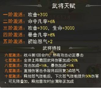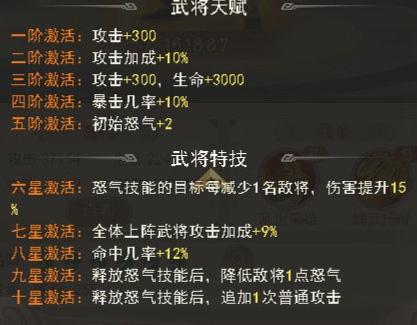 升阶加强升阶提升武将本身属性值,使曹操攻击属性更高,更快使用怒气技能。升星加强升星后的曹操对全体有非常强力的群体加成BUFF,并且升级到满星之后被动BUFF非常强力,释放怒气技能后不但可以追加攻击,还能削弱对方怒气条。