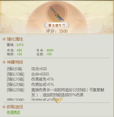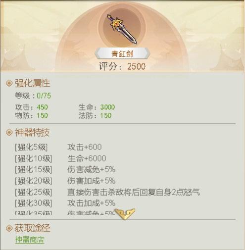 专属神器神器可以进行升级,除了对关羽本身的属性增强,达到不同等级还能增加伤害加成和伤害减免,达到25级还能给攻击加一个专属BUFF,增强攻击技能的效果。升级到50级和75级还能增加初始怒气值,使武将更快释放出怒气技能!