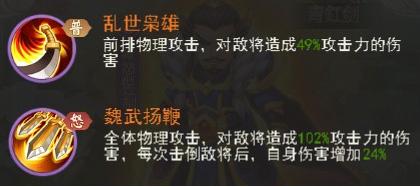 武将级别【5星】普通攻击:乱世枭雄前排物理群体攻击,对敌将造成49%攻击力的伤害。怒气攻击:魏武扬鞭全体物理攻击,对敌将造成102%攻击力的伤害,每次击倒敌将后,自身伤害增加24%。全体降低血线技能,击倒地将后还能增加自身伤害,越战越强,群体秒杀唯魏武帝!