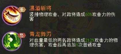 武将级别【5星】普通攻击:温酒斩将竖排物理攻击,对敌将造成60%攻击力的伤害。怒气攻击:青龙舞刃对血量最低的两名敌将造成212%攻击力物理伤害,攻击后再追加一次普通攻击。斩杀神技!无视前后排直接秒杀,还附带追击一次普通攻击。