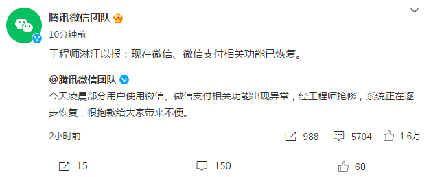 随后,据腾讯微信官方微博消息,现在微信、微信支付相关功能已恢复。