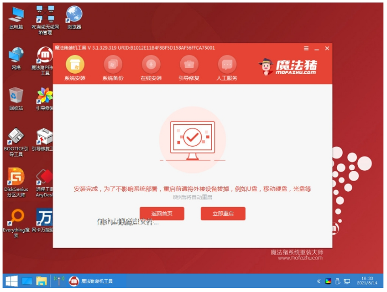 13.待提示【已完成】后,此时我们可以拔掉U盘,然后点击【重启】。