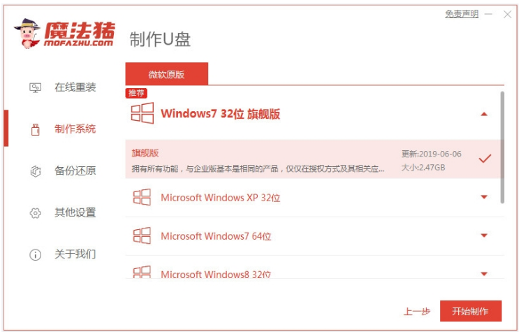 1、如何用u盘重装系统,我们首先下载安装魔法猪装机大师工具,然后插入空白u盘,然后打开软件之后选择制作系统,点击开始制作。