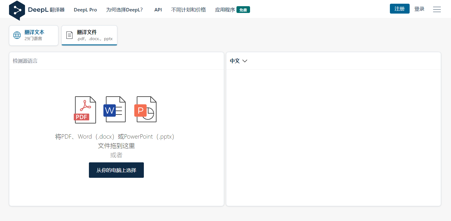 DeepL是德国研发的一款翻译神器,在译员群体中广受好评,其中就有文档翻译功能,可以翻译PDF、Word、PPT等格式的文件,可以直接进去网站,然后就可以看到“翻译文件 ”的模块