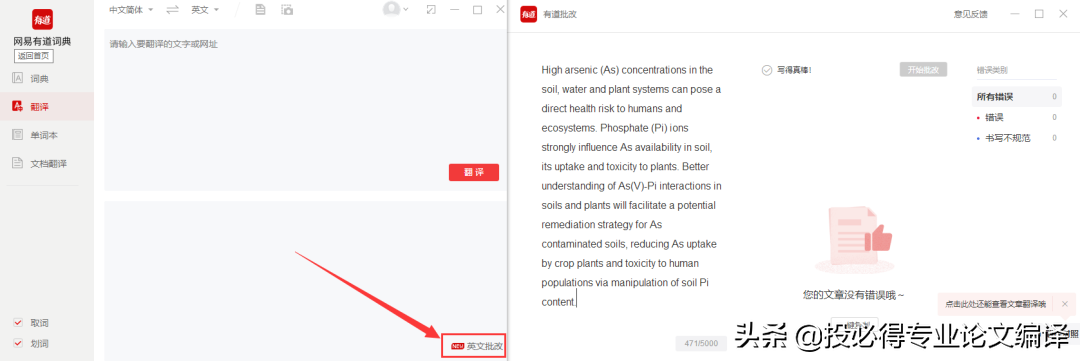 此外,最近新版本的软件中增加了有道批改这个功能,在SCI初稿的写作中,我们只需要把内容复制粘贴到对话框中即可完成,会根据不同的语法错误,对段落的内容进行修改。