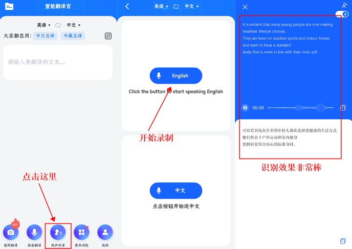 作为即时翻译类 App ,语音识别自然是其中非常重要的功能之一,在许多不得不和外国友人进行交流的场景中,翻译类 App 便成了语言不通的朋友们的「第二张嘴」。试想,打开翻译类 App ,我们对着手机说中文,外国朋友对着手机说外语,两个人就能互相理解对方所表达的意思,是不是非常神奇与酷炫呢?
