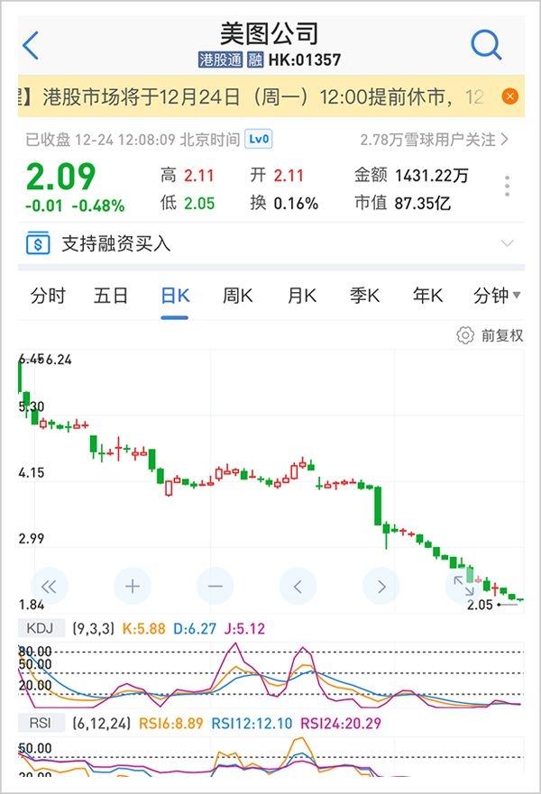 2018年以来,美图股价不断下跌。经过上市后砥砺奋进的两年,到今日(12月24日),美图公司以2.09港元收盘价创上市以来新低,目标3000亿市值的它已不足90亿港元,相比一年半前最风光时的970亿港元,总市值蒸发近900亿港元。