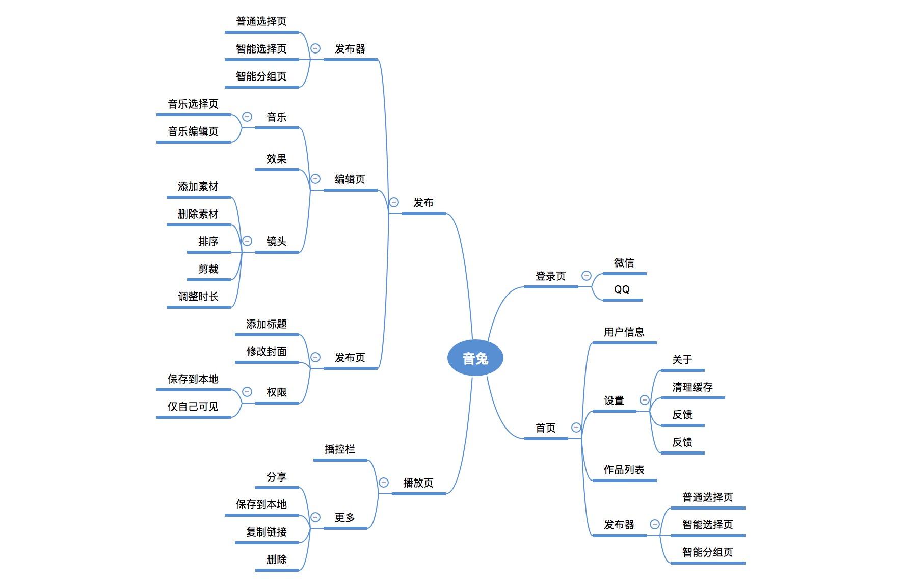 从图上可以看到,整个产品的架构相对比较轻量化,还没有向市场上流行的短视频产品那样大体量化,无论是架构还是里面的内容都相对简洁甚至简陋。尽管定义是音乐短视频,主要是制作音乐相关的视频大片的,即更加细分了场景,但是这种设计现在看来仍旧有些简陋。