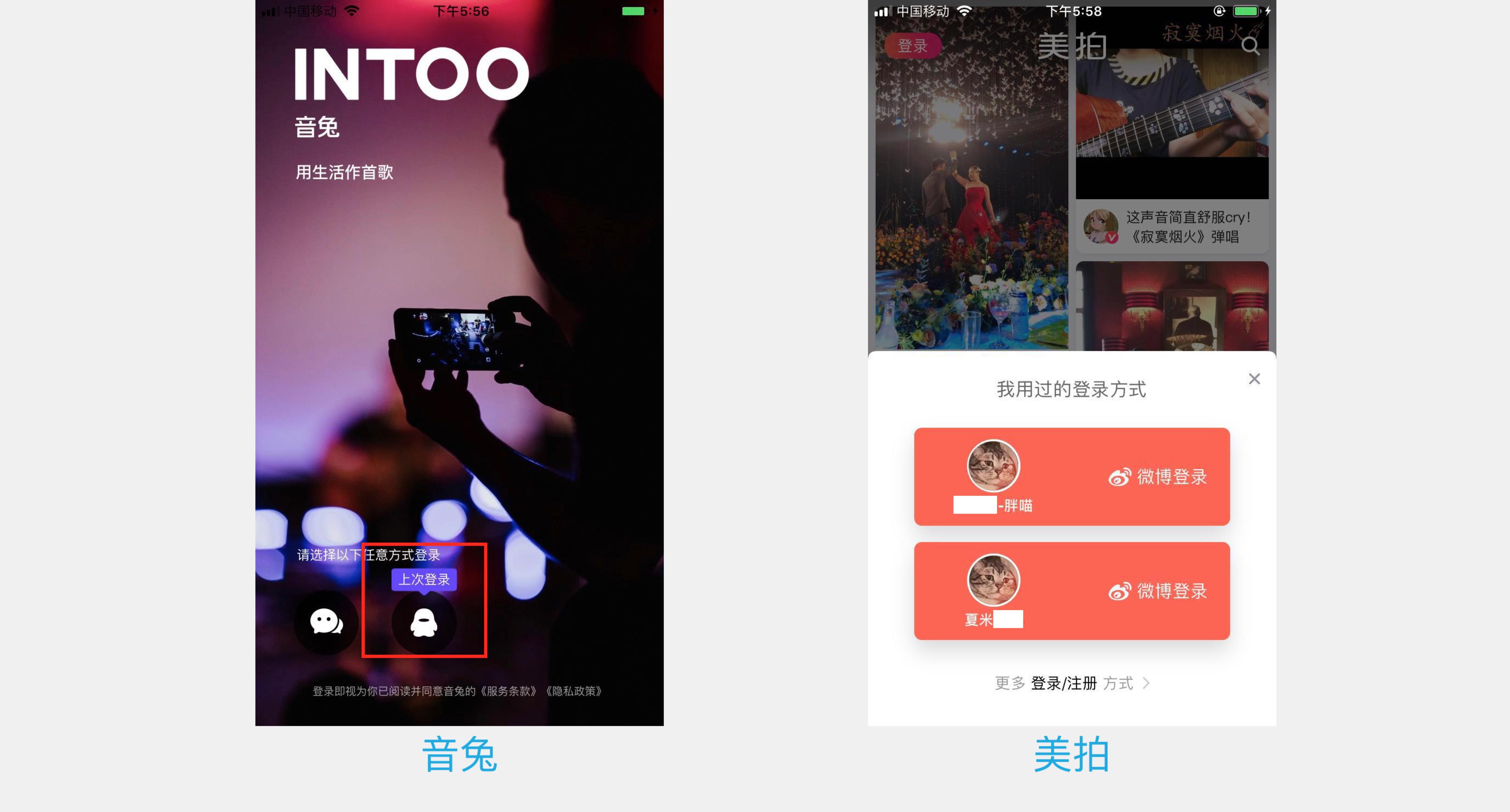 值得推荐的是,在用户退出账号后,再次启动APP时,登录页会气泡提示用户上次登录方式,与美拍的历史账号功能类似,微交互体验较好。