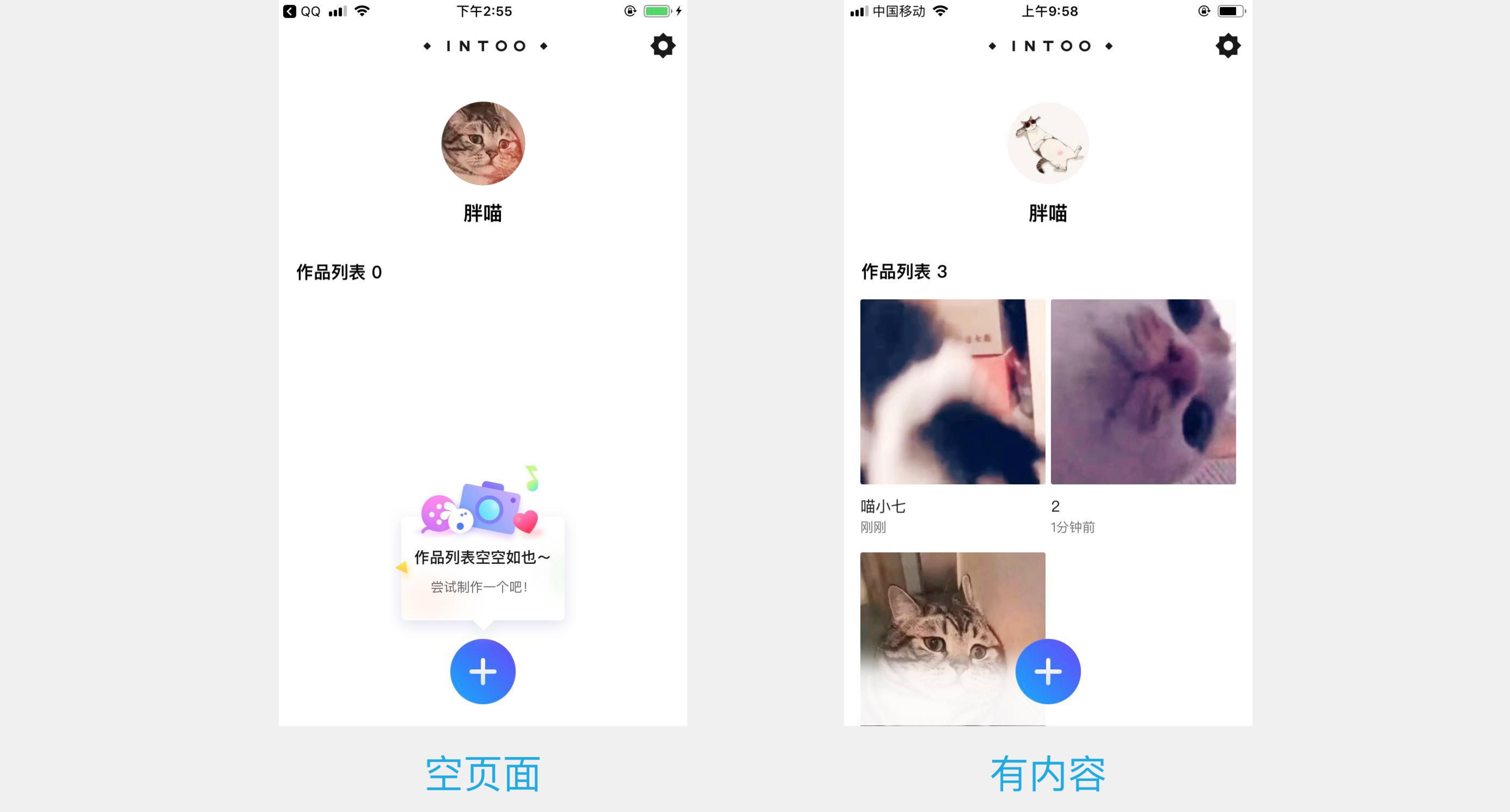 头像部分不支持点击,仅做展示,所以在列表上滑时头像会收起到左上角以节省空间;作品列表为空时,页面看起来及其简陋,更多的留白区域会让用户感到略有不适,当然可以刺激用户去发布内容,此时底部的发布器和提示是用户视觉焦点直接锁定的位置;(但是已经被培养成立即可以看到感兴趣内容的用户而言,此类性冷淡风格的大片留白页面真的让人有些难以接受,直观感觉是自己的页面崩溃了或者断网了吧?)