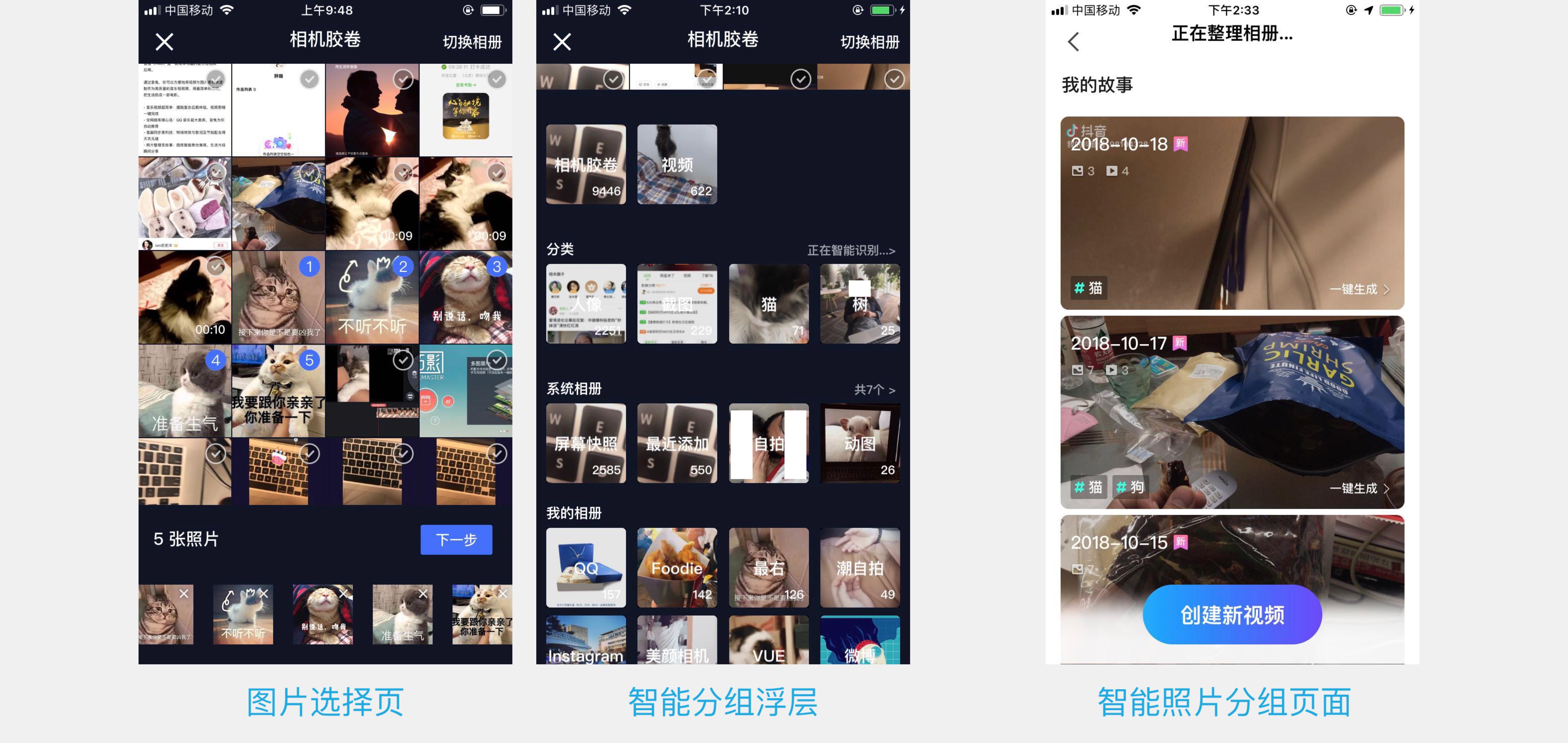 描述里的三点核心功能都是在发布器中,即智能照片分组、智能匹配背景音乐、智能匹配转场特效 三大核心功能。发布器但是在首次进入的时候,仍旧展开的普通的图片选择页面,用户手动点击右上角的“切换相册”tab后才会出现智能分组的浮层,整体页面效果略显混乱。