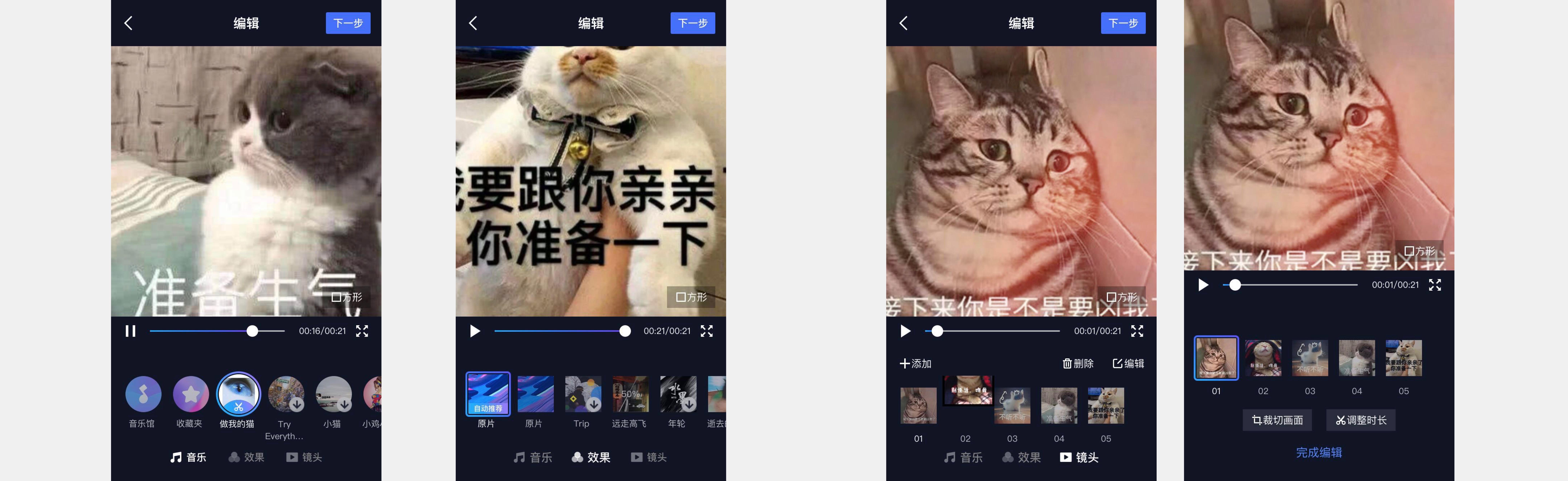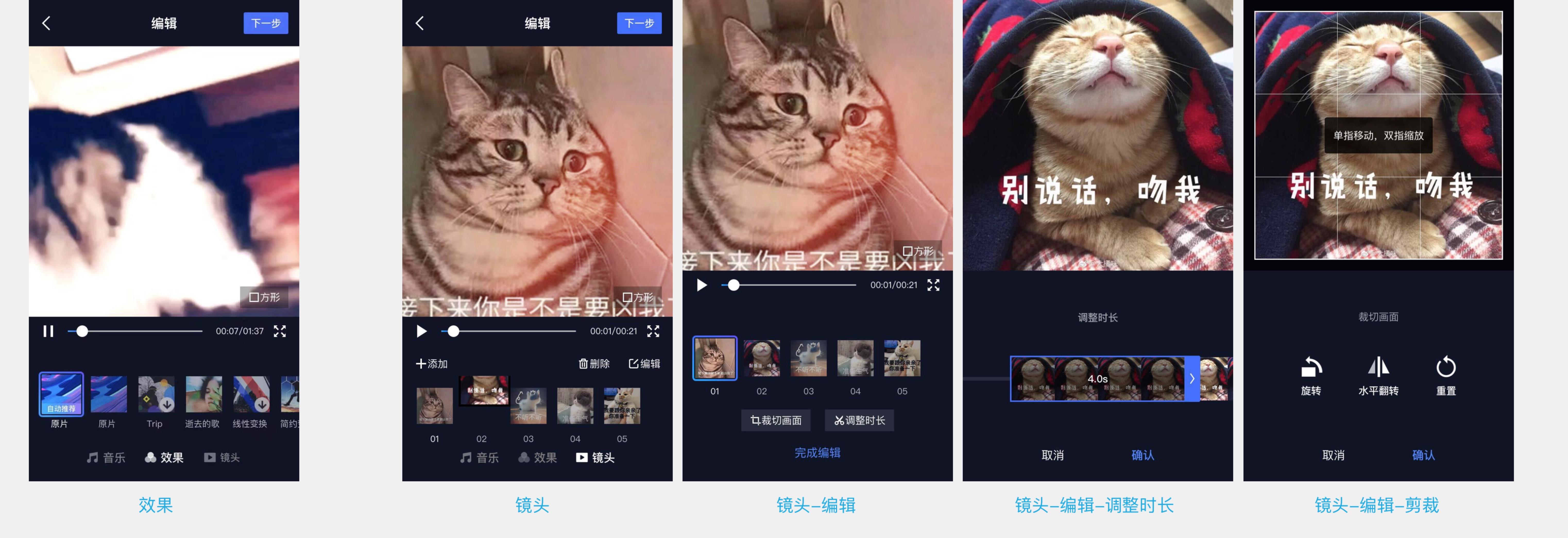 编辑页功能主要包含音乐、效果和镜头三种,核心操作在音乐功能,效果是指一些简单的特效模板;镜头可能难以理解,点击进入二级页后发现是素材编辑页,涉及到素材的剪切、调整时长和添加删除功能。