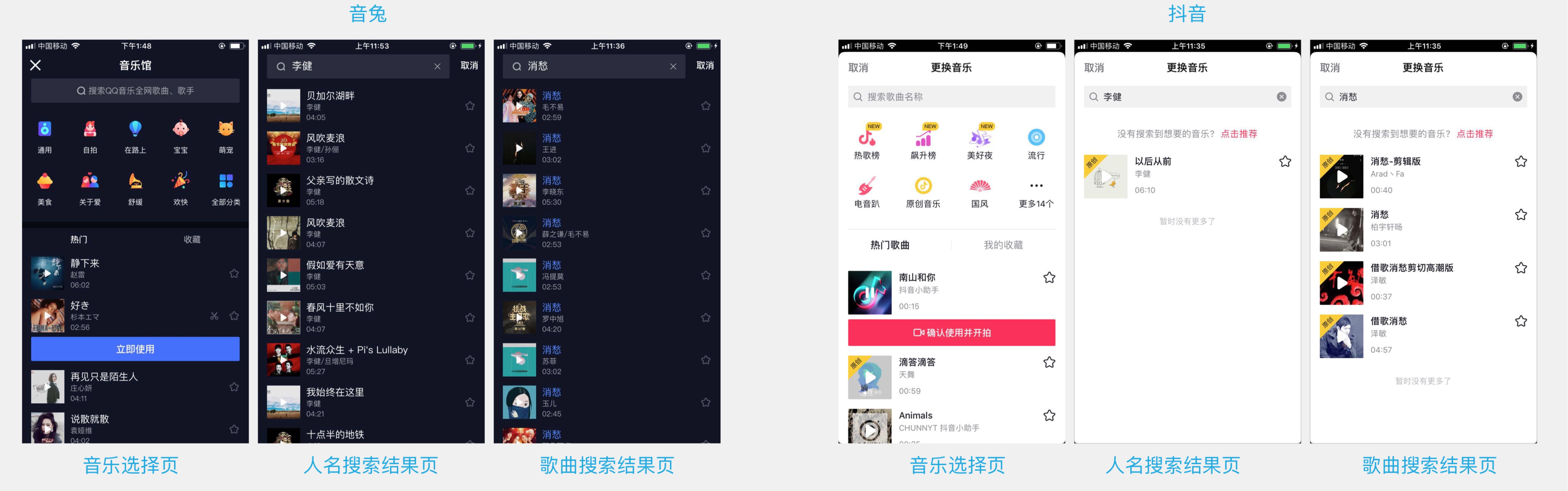 “音兔”与腾讯音乐主要链接点在于最左侧的“音乐馆”选项,点击进入的是音乐选择页,同抖音的布局相似,包括搜索框、分类与推荐/收藏列表。简单对比了一下两个产品的搜索功能,果然音兔在音乐资源上要远胜于抖音。背靠海量的音乐内容,确实发挥的空间很大,但是反过来看,同样存在问题: