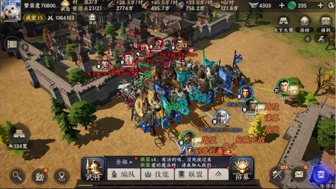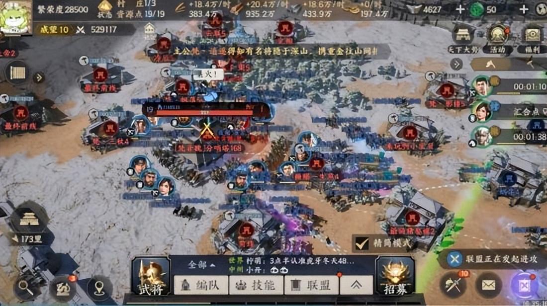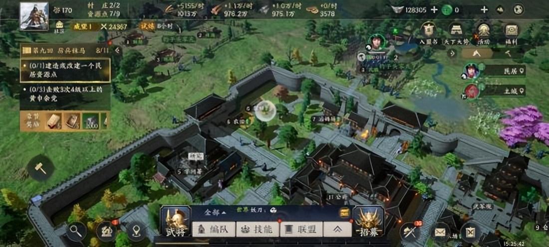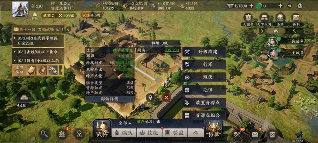 而资源地运营堪称《战地无疆》的最大创新机制,沙盘大世界地图不是随机生成资源地地块,而是随机生成村庄地块,你占领村庄后可以自行决定在村庄边造哪种资源地,村庄还具有盟友共享功能,资源地配置空前自由。再加上同一村庄下资源地可以组合大幅提升产量,新手资源获取相当充足,也大大提升了内政玩法的容错率,更不会出现平民玩家开荒一翻车就造不起兵这种事情。虽然《战地无疆》在武将设定方面和《率土之滨》比较类似,但武将养成互换功能可以方便的让你尝试各种武将配队,新手友好度自然比其他率土like游戏都要高。