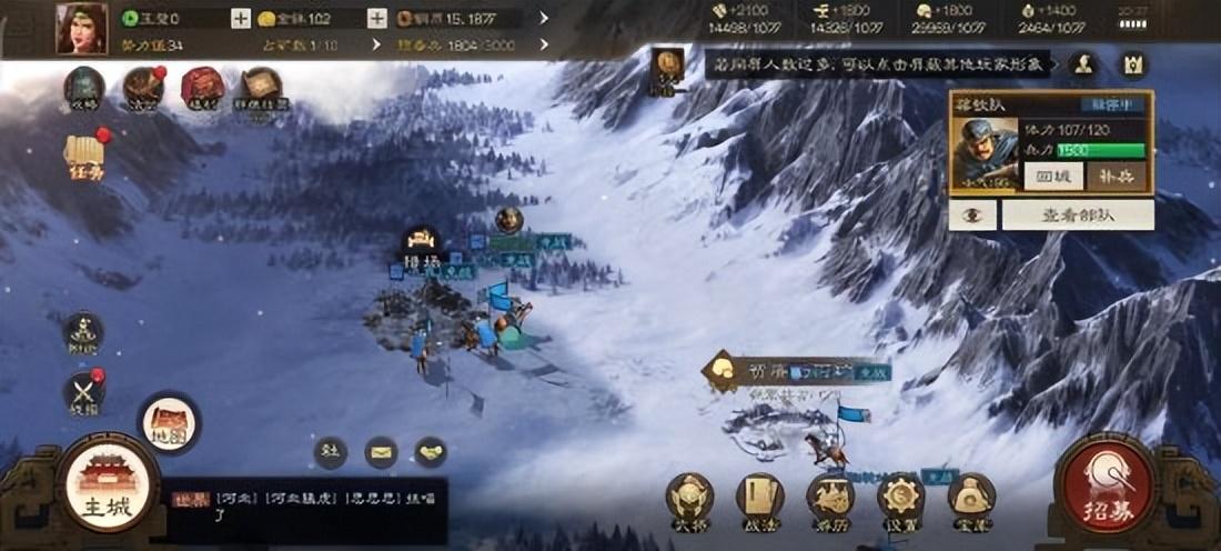 而在世界地图,乍一看三棋的地图比较像RPG,画风还挺好,可仔细一看其实全是静态图,虽然也做了空中飞雪的效果,但是地图上的迷雾云根本不会动,拉视角也只能拉近人物不能拉近地形细节,综合看也只能说一般。