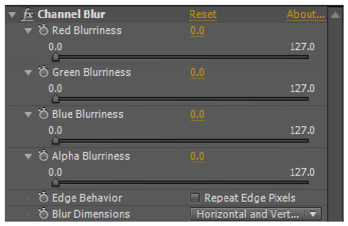 Blur&Sharpen(模糊&锐化)特效组用于对图像进行各种模糊和锐化处理,共包括17 种特效:BilateralBlur(双向模糊)、BoxBlur(盒状模糊)、CameraLensBlur(镜头模糊)、CCCrossBlur(交叉模糊)、CCRadialBlur(CC放射模糊)、CCRadialFastBlur(CC快速放射模糊)、CCVectorBlur(通道矢量模糊)、ChannelBlur(通道模糊)、CompoundBlur(混合模糊)、DirectionalBlur(方向模糊)、FastBlur(快速模糊)、GaussianBlur(高斯模糊)、RadialBlur(径向模糊)、ReduceInterlaceFlicker(降低隔行扫描闪烁)、Sharpen(锐化)、SmartBlur(精确模糊)、UnsharpMask(反遮罩锐化)。