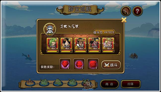 30级后珍宝巡航开启,珍宝巡航可以说是这个游戏的核心之一了,这里是晶石的主要产地。总共5个岛,每个岛有3位玩家,每战胜一个玩家我们可以获得一个晶石奖励。通关每个岛可以获得一个宝箱奖励,里面有大量的贝里还有晶石、伙伴进阶道具、伙伴碎片以及伙伴奖励。