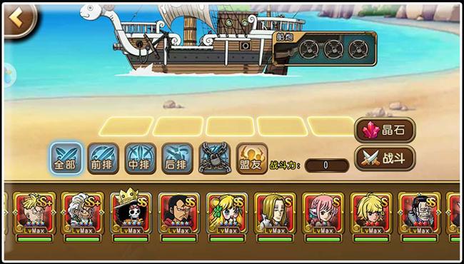 进入游戏玩家创建好自己的海盗团后就可以开始冒险了,刚开始我们就拥有主角A级路飞,然后跟着游戏教程走,会在酒馆中进行钻石抽奖获得A级烟鬼(这是系统赠送的,游戏没有首抽,所以第一次钻石抽奖建议还是十连,因为单抽也有可能只给你个道具而已)。烟鬼在一次次的修改后最后变得十分的强力,本来雪糕君是不推荐的,不过从三测的烟鬼来看是很值得培养的,碎片精英副本可刷,开场技能可以打对方的前中后三排,可谓十分给力;酒馆的金币抽奖是Mr5(也算是系统赠送了),算是前期比较给力的,碎片也比较好获得,前期可以过渡一下,等你第一次十连抽后我想你就不需要他了。