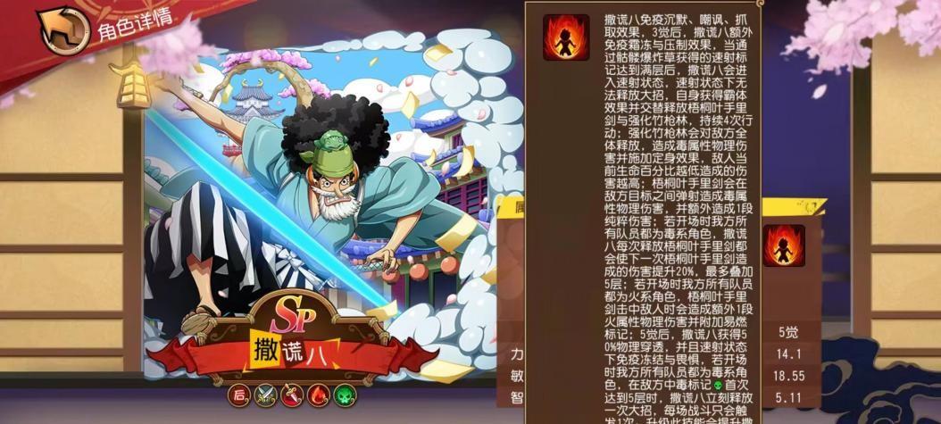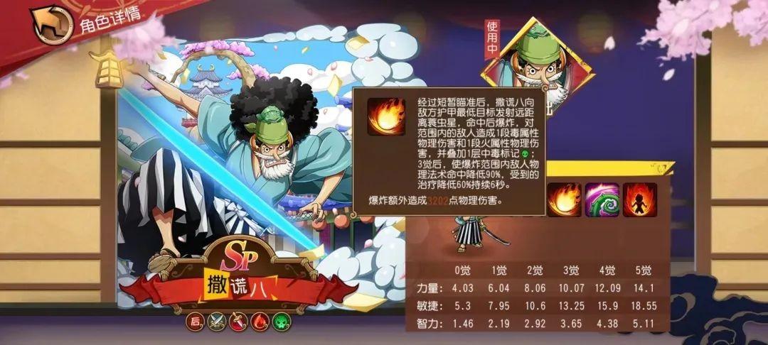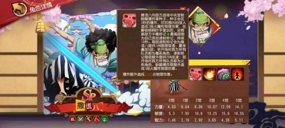 6月2日「蛤蟆油商人」 SP撒谎八正式上线《航海王 启航》,不出大家的所料,撒谎八以火、毒双标签的身份登场,虽然立绘上以佩戴双刀的方式出现,但这只是在和之国环境下为方便遮掩身份的选择,拥有斩击标签的可能性只当是笑谈了。不过,启航在撒谎八的技能设定上却非常应景,把武士技能与撒谎布的能力完美的结合在了一起。具体技能详解,请看以下分析——
