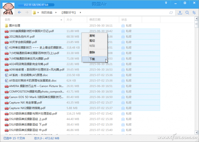 云空间也可以对已经同步的数据进行管理(下载、编辑、移动、删除)