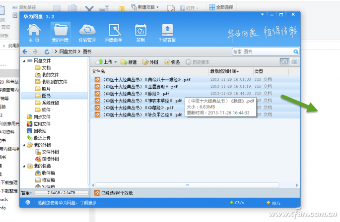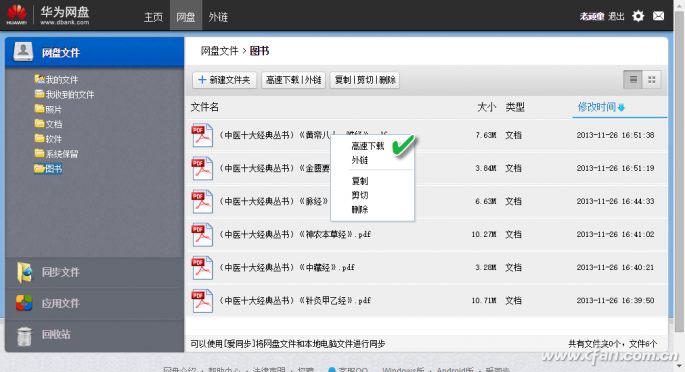 首先访问华为网盘的Web端页面,用自己的华为账号登录到网盘云端(图8)。选择需要取回本地的所有文件,然后选择右键菜单中的“高速下载”命名,将文件迅速到本地(图9)。