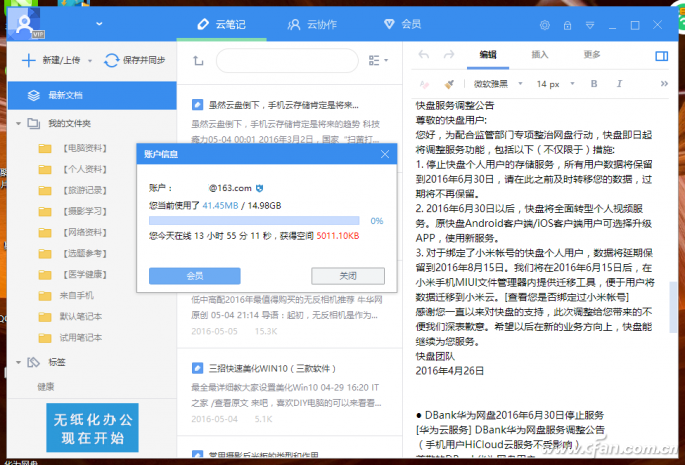 在云盘“关门停业”之后,为了延续我们的网上存储习惯或任务,除了选择仍在营业的其他云盘外,我们还可以选择非主打网络存储业务的软件产品,比如可以选择云笔记类的软件来代替云盘。其中国产网络云笔记有道云笔记值得一用,因为它除了主要文章收藏和同步编辑外,其附件功能对文件备份的支持也很有强。如果对文件备份有更多的要求,通过申请会员,可以扩大附件文件的存储空间,从而保证自己的文件存储的扩大化和安全性。