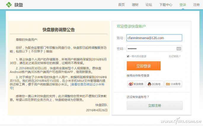 迅雷快盘中个人文件存储的有效期限是2016年6月30日。若绑定了小米账号的快盘个人账号,数据可延期保留到2016年8月15日。这部分小米用户从6月15日后,可通过小米手机MIUI文件管理器内的文件迁移工具,将快盘文件迁移到小米云中进行存储。对于其他的快盘用户,快盘云端文件的处理,首先需要选择一种获取方式。登录快盘网页版,输入自己的快盘账号与密码(图14),进入文件管理方式选择窗口。