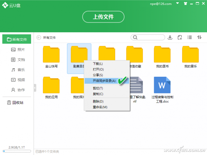 如果使用快盘云U盘来取回资料,可利用云U盘提供的同步目录功能,一次最多可以将5个云端文件夹同步到本地存储。具体操作:首先通过云U盘的设置菜单选择“设置同步文件夹”,指定一个本地数据分区的文件夹作为同步文件夹(图16)。然后在云U盘的主目录内,右键单击要同步的文件夹,并在快捷菜单中选择“开启同步文件夹”,即可将云端选中的文件夹下的文件自动下载到本地的同步文件夹中(图17)。
