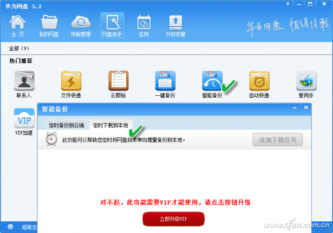 如果你是华为的VIP用户,还可以根据自己的时间,安排定时任务,将云盘中的文件自动下载到本地备份。在华为网盘客户端窗口中点击工具栏上的“网盘助手”按钮,然后点击“智能备份”,在弹出的窗口中选择“定时下载到本地”选项卡(图12),接下来定义需要下载的文件夹和设定自动下载时间即可。