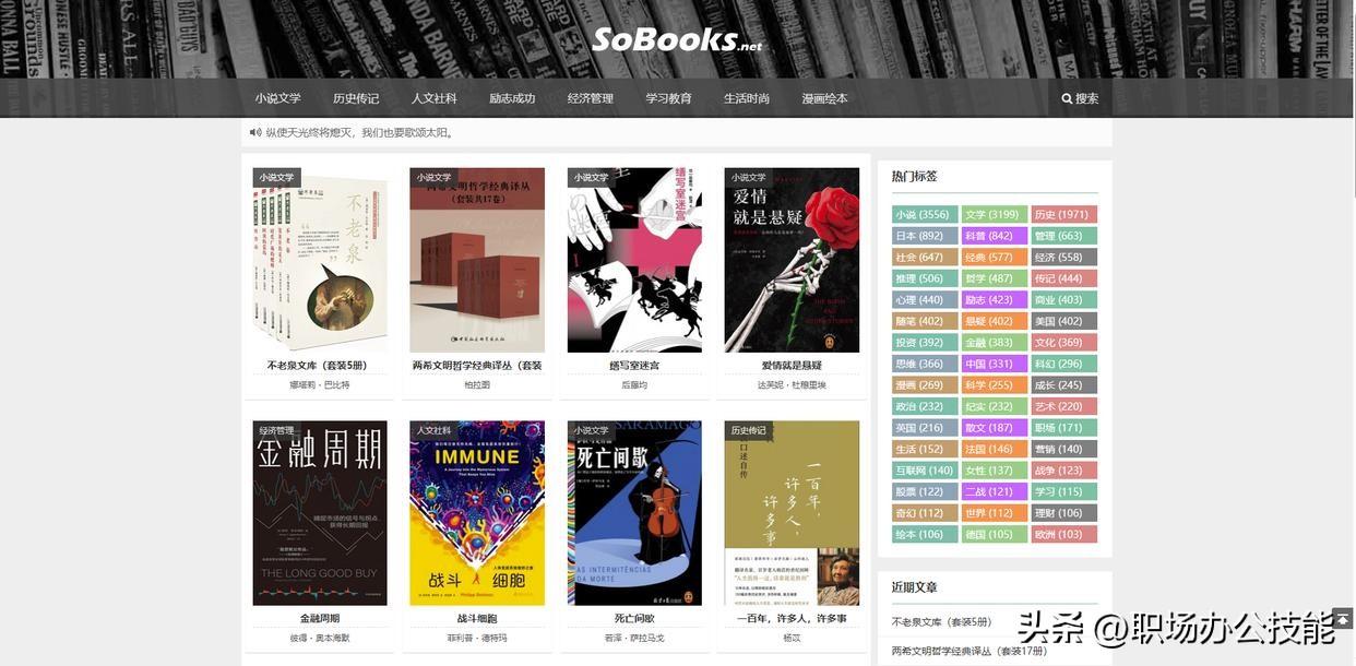 一个国内的优质电子书下载网站,里面提供了文学小说、历史传记、人文社科、励志成功、教育学习、漫画绘本等类型的电子书,还有一些热门标签,点击就能查看相应的电子书。