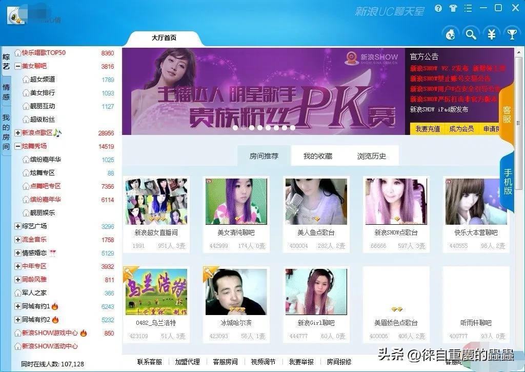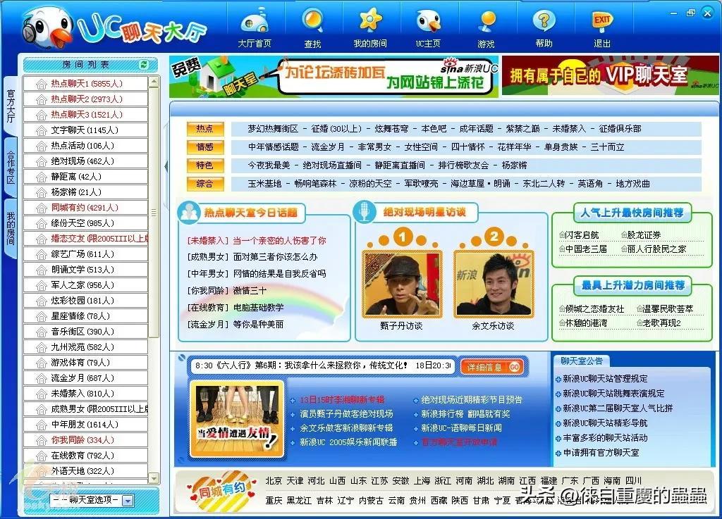 有网友说,新浪uc聊天软件是八零后一代网民最为美丽的回忆,对此老朽不敢苟同,因为我执拗地认为它也是七零后,甚至是六零后这两代网民最为美丽的记忆。我就是一个七零后的糟老头,曾经刻肌刻骨地玩过一段时间的新浪uc聊天软件,对该软件有大家可能也会有的刻骨铭心的感受和记忆。第一次接触新浪uc是在2006年7月,跟随几十位同事狗颠尾巴似的到海兰云天度假村泡温泉,扭扭捏捏和羞羞答答地泡温泉的过程中,一位名叫木子李的同事悄悄地来到我身边神神秘秘地告诉我他扎到一款撩M的聊天软件,即新浪uc聊天软件。这款聊天软件与扣扣软件有着明显不同的地方,即拥有很多各种各样的聊天室,根据人气划分,有的聊天室是单视频房间,有的聊天室是双视频甚至是三视频房间。不过,当时我对UC聊天软件没有兴趣,胡乱扛着“点我名字我电你”的马甲在各大聊天室招摇撞骗地走一遭没有找到合适的目标后,感到素然无味,仍然我行我素地玩扣扣四国军棋游戏。