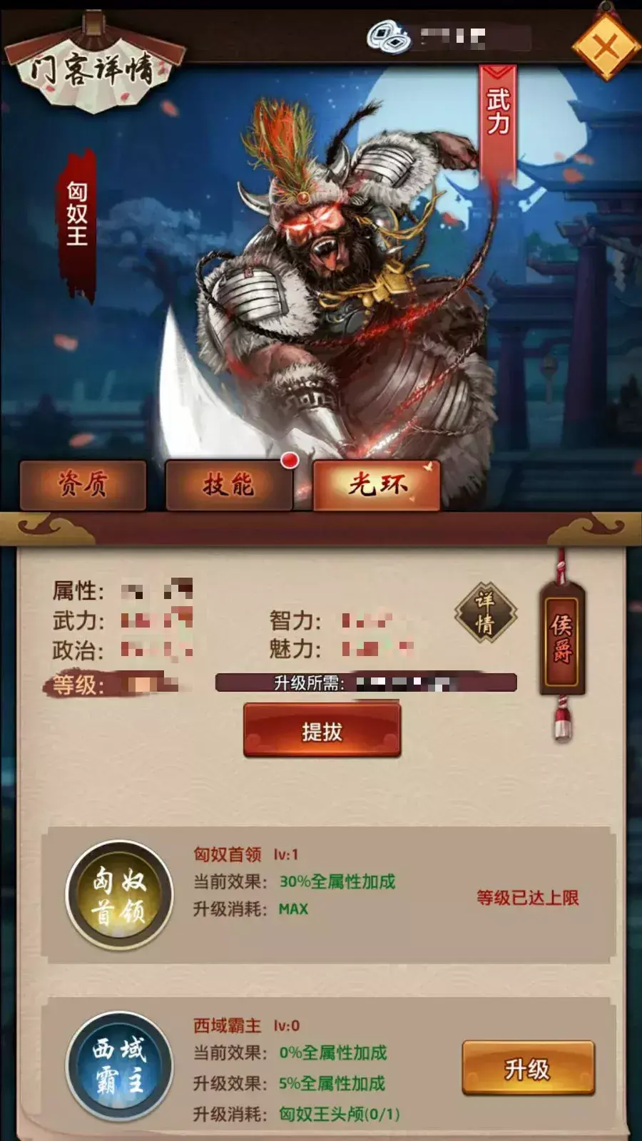 门客的初始等级是100级,满级后需要通过提拔才能继续升级,提拔需要相应的道具,最低的男爵道具在战场兑换、帮会兑换里的积分兑换中兑换,所以你要坚持每天中午晚上打战场和积极参加帮会副本建设,不然没积分就没道具来提门客了,提拔一次等级上限加50级,下次则需要更高级的道具来提拔合成在道具里面。