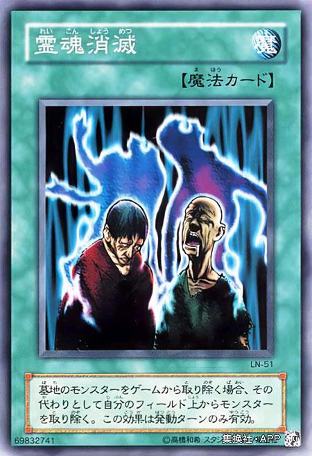 ●发售初期就一大堆裁定为「调整中」的卡。在掌机平台的好几款游戏中这张卡都没有收录,甚至后来游戏王OL直接将这张卡拿掉。当时有坊间传闻说,这是因为这张卡卡名宣扬的「灵魂消灭论」让海外一些宗教支持者感到不满的缘故。但这张卡的英文版名称是「Spirit Elimination(除灵)」,似乎没有什么直接关系。